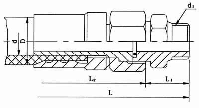 標(biāo)記示例:高壓膠管總成L=2L1+L2 ZY440.1.00 注:1. 膠管接頭應(yīng)符合JB1885-77《A型扣壓式膠管接頭》標(biāo)準(zhǔn)的要求; 2. 膠管總成長(zhǎng)度L由設(shè)計(jì)者自行選定,膠管總成的總長(zhǎng)為L(zhǎng)=2L1+L2; 3. 若連接螺紋d1不是表中規(guī)定值,請(qǐng)?jiān)O(shè)計(jì)者自行設(shè)計(jì)內(nèi)接頭。 | |