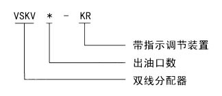 一、使用條件 VSKV-KR型雙線分配器正面設上下二排出油口,分配器活塞正反向動作時分別從上排和下排的出油口排出潤滑脂。還可以從指示桿的動作直接觀察分配器的工作情況,并可通過調整螺釘在規定范圍內調整出油口的給油量。 該型分配器適用于公稱壓力為40MPa 的雙線式干油集中潤滑系統中,它在兩條供油主管交替的供油壓力作用下,直接由供油壓力控制活塞動作給油,完成向潤滑點定量分配潤滑脂的功能。