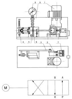 電動機經(jīng)蝸輪蝸桿減速后,由偏心輪2帶動連桿3 作直線往復(fù)運動。由于連桿末端所連動的彈簧機構(gòu)4的作用,使二位四通閥5中的滑芯桿6產(chǎn)生急速的推拉動作,從而改變二位四通閥各油口的聯(lián)接方式,達到液流換向的目的。此時,偏心輪旋轉(zhuǎn)了180°到達另一個死點位置,觸動了限位開關(guān)7。限位開關(guān)即可送出脈沖信號,停止閥電機運行,完成了一個工作過程。壓力表8裝于防護罩9頂部用于監(jiān)視閥內(nèi)的工作壓力。